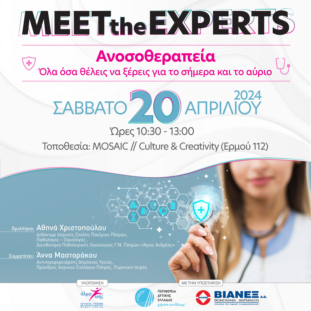 Ξεκινά τον Απρίλιο  ένας  νέος κύκλος ενημερωτικών και εκπαιδευτικών συναντήσεων για ασθενείς με καρκίνο γενικότερα, αλλά, βεβαίως,  και για τον γενικό πληθυσμό, για όλους όσους θέλουν να λύσουν τις απορίες τους για ιατρικούς χειρισμούς, που έχουν σχέση με τον καρκίνο. Οι συναντήσεις αυτές με τον  τίτλο «MEET THE EXPERTS», διοργανώνονται από τον Σύλλογο Γυναικών με καρκίνο Μαστού «Άλμα Ζωής» Ν. Αχαΐας και είναι εντελώς δωρεάν για όποιον επιθυμεί να συμμετέχει.