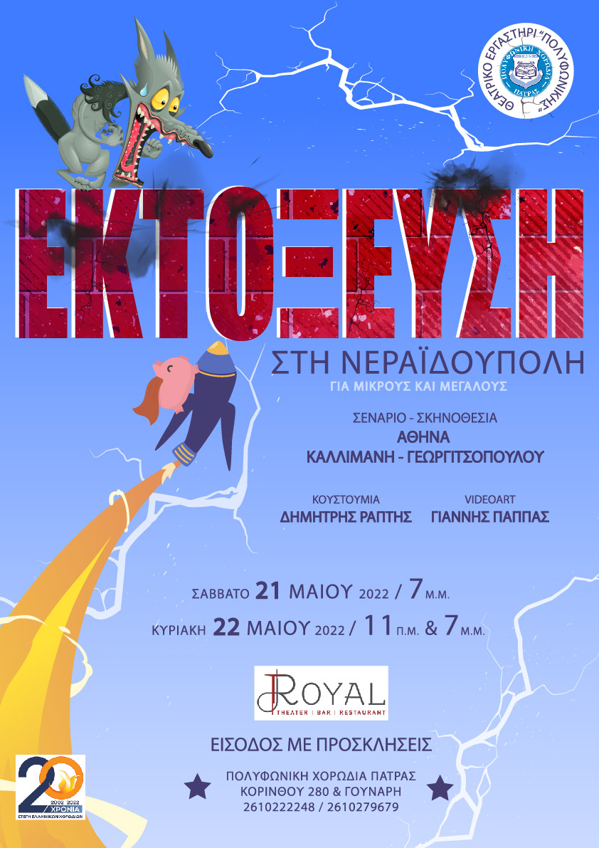 Νέα παράσταση για μικρούς και μεγάλους ετοιμάζει το ΘΕΑΤΡΙΚΟ ΕΡΓΑΣΤΗΡΙ [ενηλίκων] της «ΠΟΛΥΦΩΝΙΚΗΣ», με το τίτλο: «ΕΚΤΟΞΕΥΣΗ ΣΤΗ ΝΕΡΑΪΔΟΥΠΟΛΗ», που θα πραγματοποιηθεί στο θέατρο «ROYAL», το προσεχές Σαββατοκύριακο 21 και 22 Μαΐου.