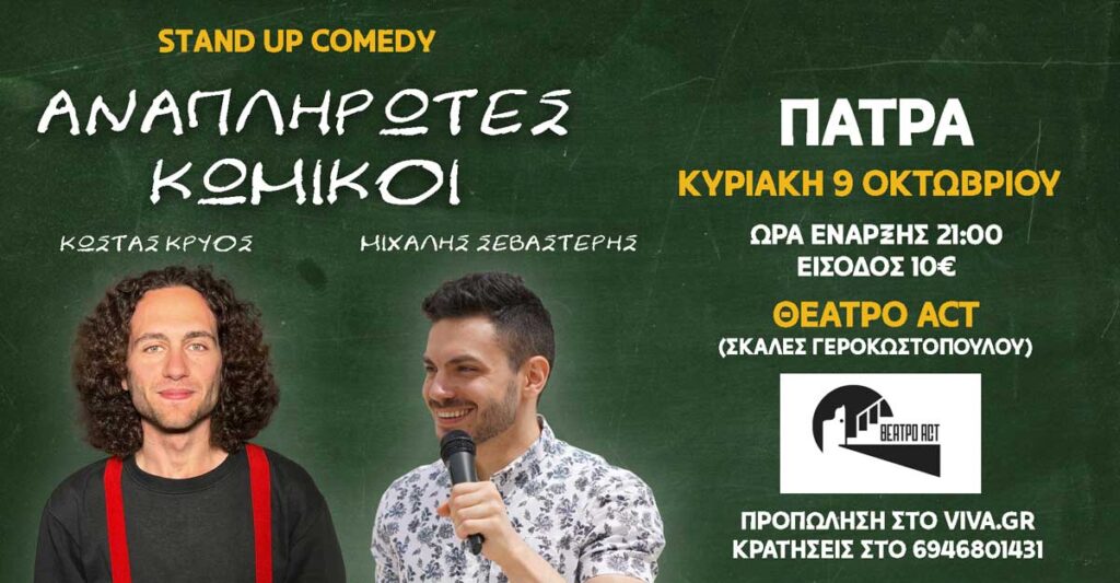 Δύο από τους ανερχόμενους κωμικούς της Αθηναϊκής σκηνής του stand up comedy έρχονται στην Πάτρα και το Θέατρο Act για μία, μοναδική παράσταση («εκτός αν πάμε καλά και ξανάρθουμε»).