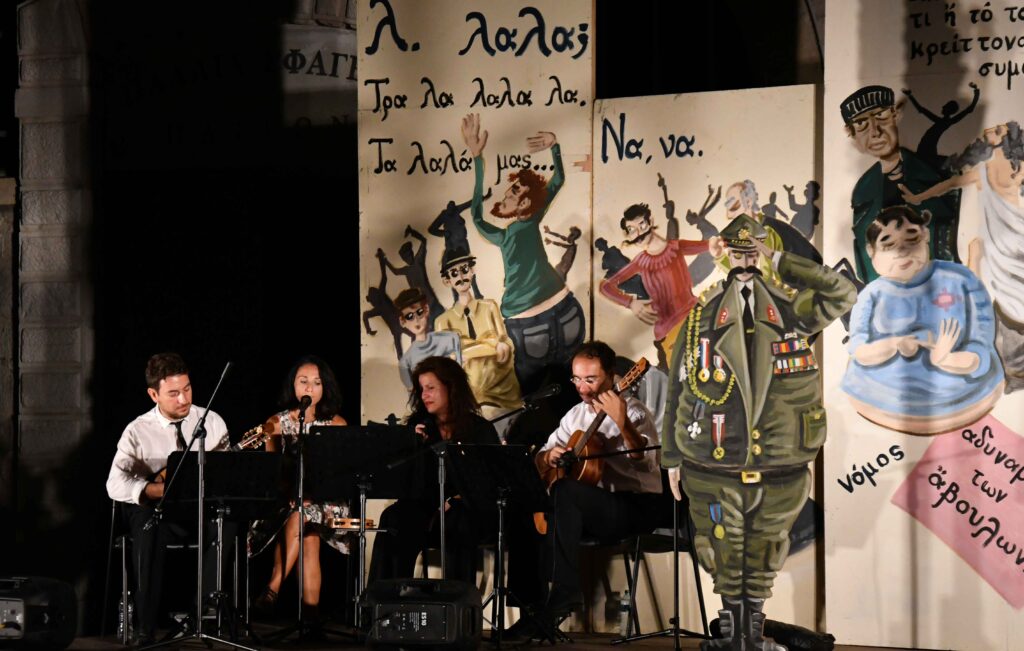 Στην παράσταση παίζεται ζωντανά μελοποιημένη ποίηση των, Βάρναλη, Λασκαράτου, Σουρή, Άμβλιχου , Πανά , Γιαλαμά σε πρωτότυπη μουσική.