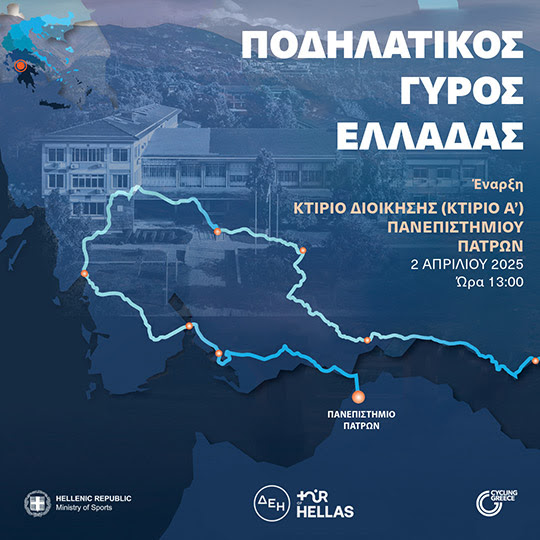 Σας προσκαλούμε όλους και όλες στις 2 Απριλίου 2025 και ώρα: 13.00 στο Πανεπιστήμιο Πατρών (εξωτερικός χώρος Κτιρίου Διοίκησης Α’) για να παρακολουθήσετε από κοντά την εκκίνηση του ΔΕΗ Tour of Hellas 2025!