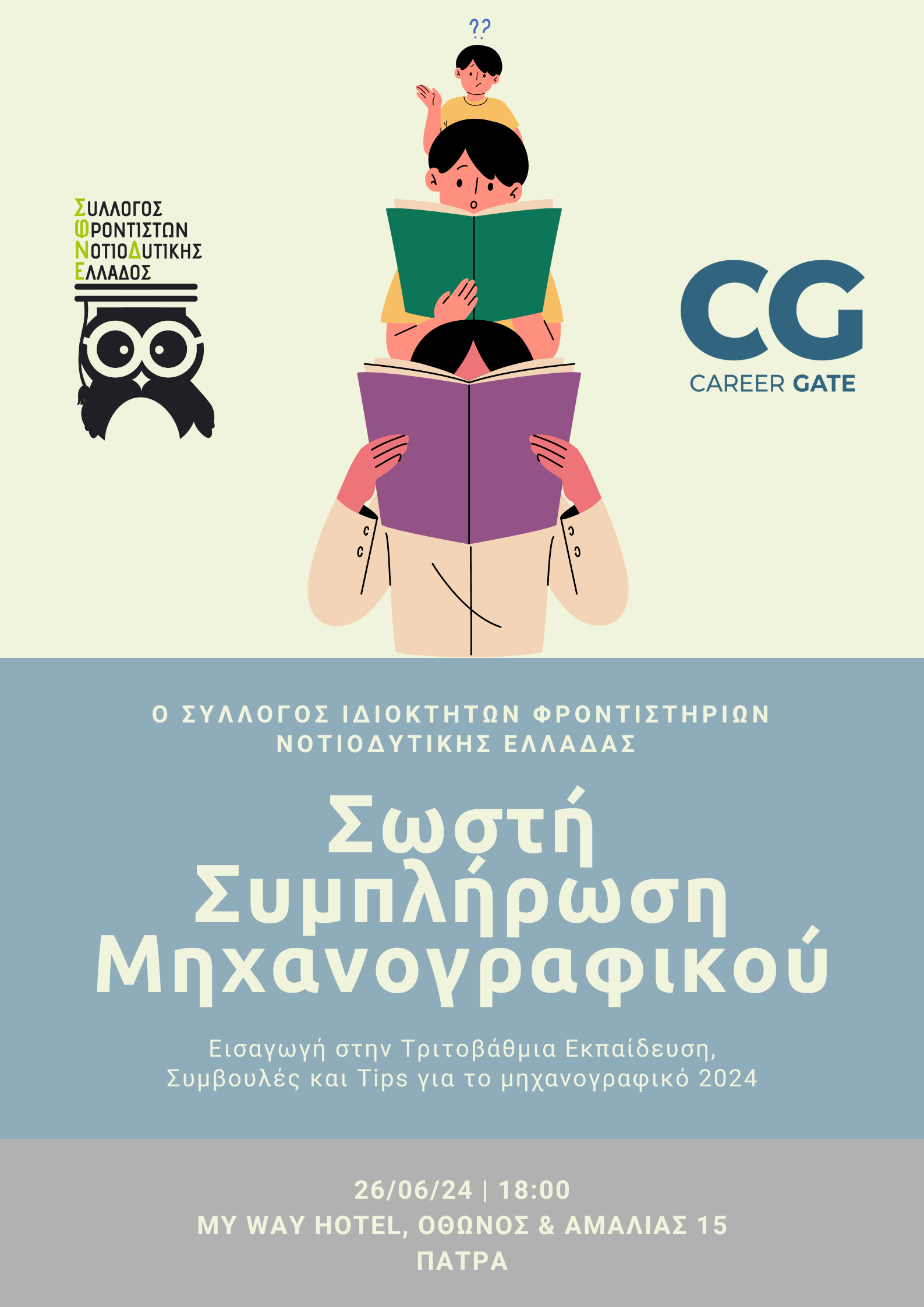 O Σύλλογος Ιδιοκτητών Φροντιστηρίων Νοτιοδυτικής Ελλάδας διοργανώνει στην Πάτρα ημερίδα με τίτλο «Σωστή συμπλήρωση μηχανογραφικού», την Τετάρτη 26 ΙΟΥΝΙΟΥ 2024 και ώρα 18:00 στο Ξενοδοχείο MYWAY HOTEL AND EVENTS, αίθουσα εκδηλώσεων με προσκεκλημένο το κ. Κωνσταντίνο Κατσανέβα από την Career Gate.