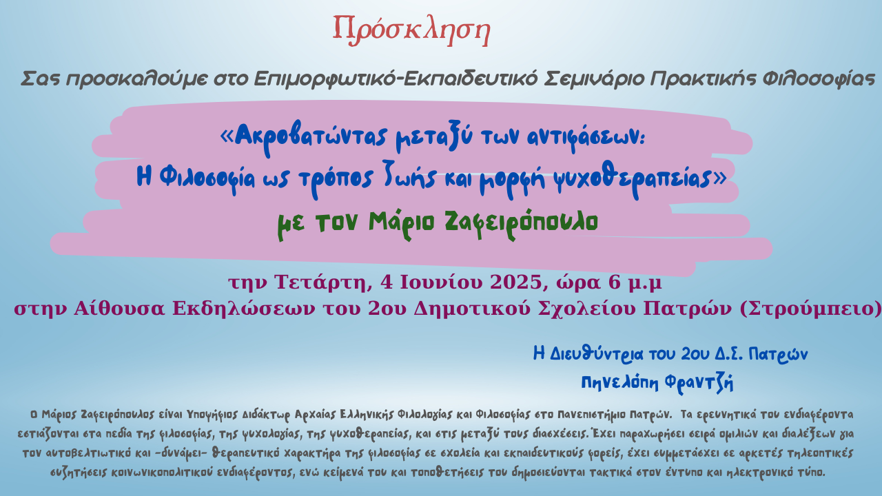 Την Τετάρτη 4 Ιουνίου 2025 και ώρα 18:00, η Πάτρα θα φιλοξενήσει ένα ιδιαίτερο επιμορφωτικό-εκπαιδευτικό σεμινάριο πρακτικής φιλοσοφίας με τίτλο: