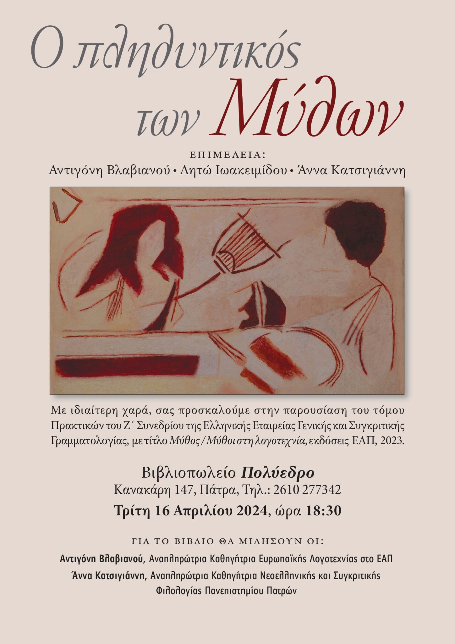 Παρουσιάζεται την Τρίτη 16 Απριλίου, στις 6 και μισή το απόγευμα, ο τόμος των Πρακτικών του Ζ΄ Συνεδρίου της Ελληνικής Εταιρίας Γενικής και Συγκριτικής Γραμματολογίας, με τίτλο Μύθος/ Μύθοι στη λογοτεχνία, που κυκλοφορεί από τις εκδόσεις ΕΑΠ.