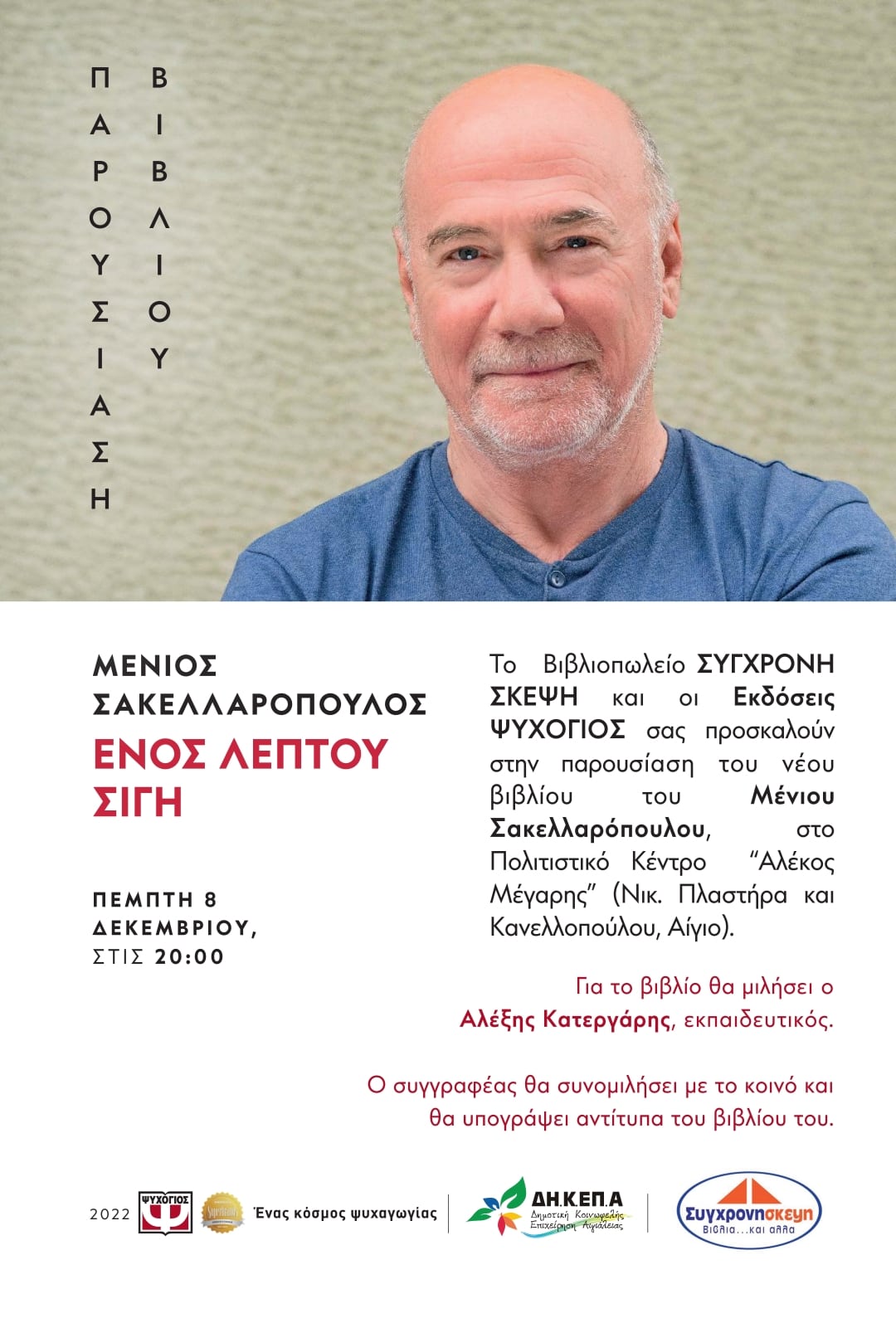 Το Βιβλιοπωλείο ΓΩΝΙΑ ΤΟΥ ΒΙΒΛΙΟΥ – ΠΑΠΑΧΡΙΣΤΟΥ και οι Εκδόσεις ΨΥΧΟΓΙΟΣ συνδιοργανώνουν παρουσίαση του βιβλίου του Μένιου Σακελλαρόπουλου ΕΝΟΣ ΛΕΠΤΟΥ ΣΙΓΗ