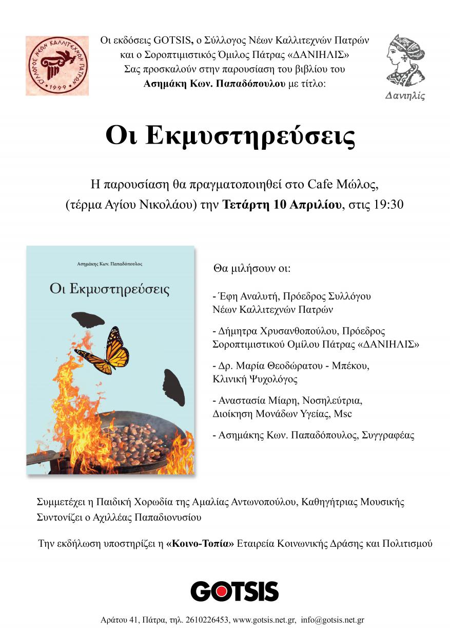 Οι εκδόσεις GOTSIS, ο Σύλλογος Νέων Καλλιτεχνών Πατρών και ο Σοροπτιμιστικός Όμιλος Πάτρας <<ΔΑΝΙΗΛΙΣ>> με την υποστήριξη της Εταιρείας Κοινωνικής Δράσης και Πολιτισμού Κοινο_Τοπία www.koinotopia.gr παρουσιάζουν το νέο βιβλίο του Ασημάκη Παπαδόπουλου ‘‘Οι εκμυστηρεύσεις’’ την Τετάρτη 10 Απριλίου στις 7.30μμ στο cafe Μώλος, (τέρμα Αγίου Νικολάου).