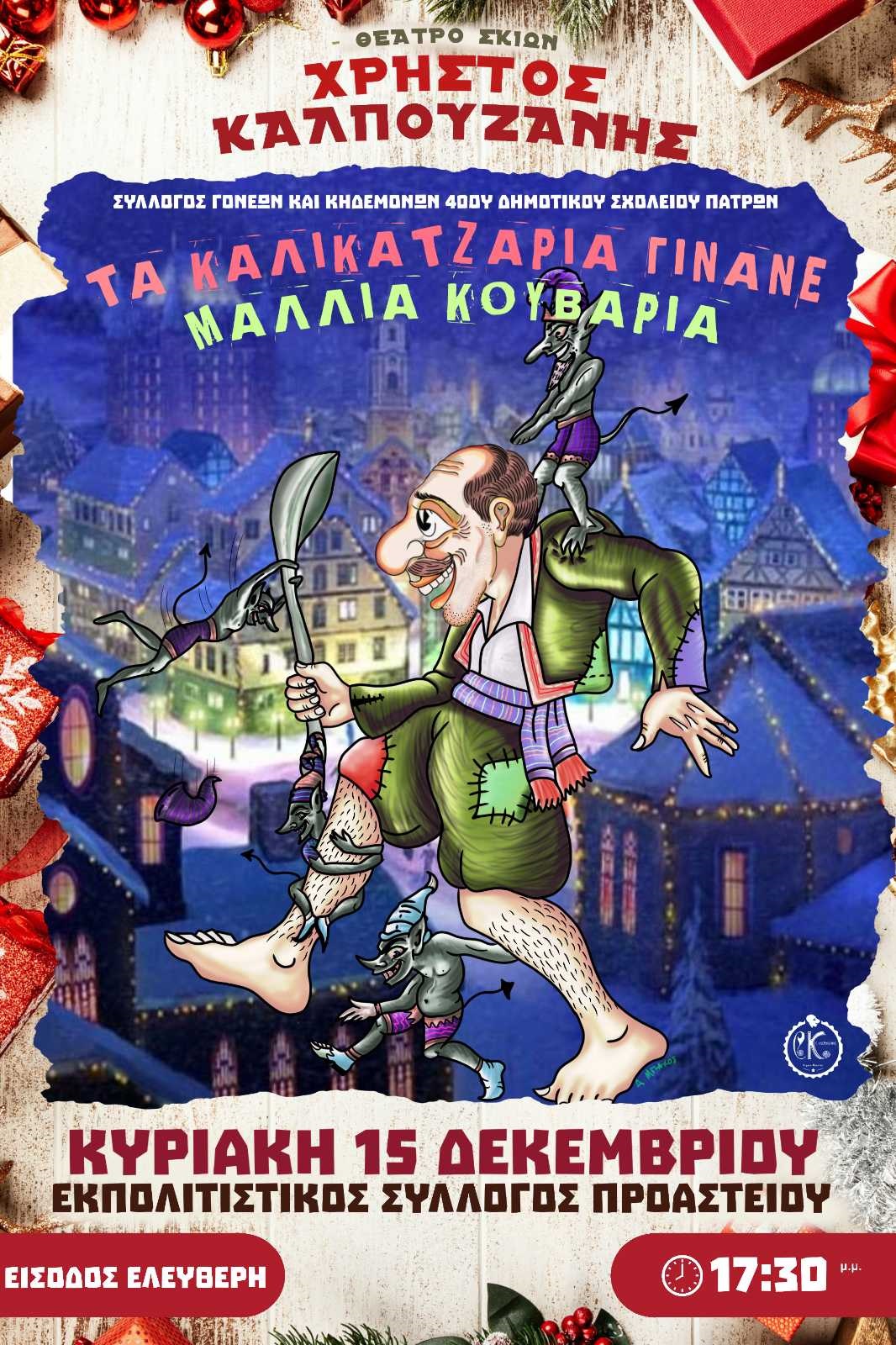 Την Κυριακή 15 Δεκεμβρίου στις 5.30 το απόγευμα το Θέατρο Σκιών θα κάνει «στάση» στο χώρο του 40ου Δημοτικού Σχολείου Προαστείου, με τα «Καλικαντζάρια» να γίνονται επί σκηνής υπό την… καθοδήγηση του καραγκιοζοπαίχτη Χρήστου Καλπουζάνη «μαλλιά κουβάρια».